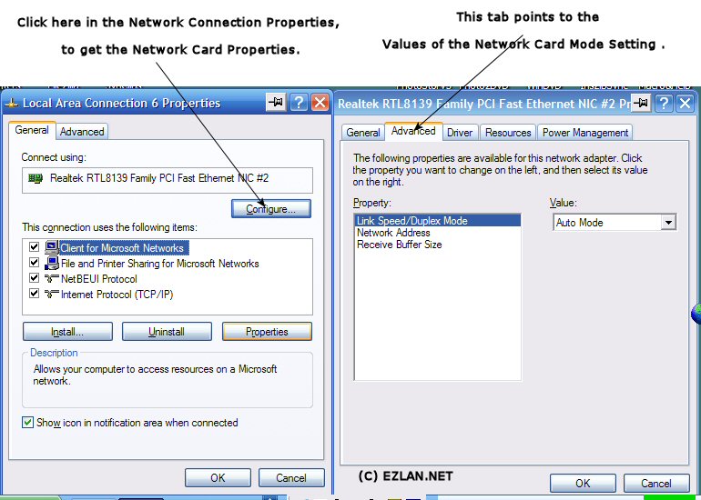Mobile Net Switch Q - How should I adjust the Network Cards (NIC) Speed? A- Click on Control Panel / Network Connection, and right click on the active Local Network Connection to get the properties. Click on the Network Card configuration and choose the working Speed (bandwidth) of the card. In most cases it is best to choose the Auto Mode. However if you