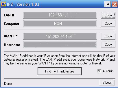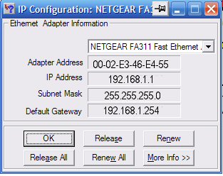 Using IPCONFIG Command Line Utility, and or Winipcfg (Wntipcfg) GUI Utility to find Local Network Info (IP, MAC). If this page would not make sense to you read this page first. Link to: How Do I Find my IP and MAC Numbers. IPCONFIG Command Line Utility should Yield: Windows IP Configuration Host Name . . . . . . . . . . . . : PCH Primary Dns Suffix . . . . . . . : Node Type . . . . . . . . . . . . : Unknown IP Routing Enabled. . . . . . . . : No WINS Proxy Enabled. . . . . . . . : No Ethernet adapter Local Area Connection 4: Connection-specific DNS Suffix . : Description . . . . . . . . . . . : NETGEAR FA311 Fast Ethernet Adapter Physical Address. . . . . . . . . : 00-02-E3-46-E4-55 Dhcp Enabled. . . . . . . . . . . : Yes Autoconfiguration Enabled . . . . : Yes IP Address. . . . . . . . . . . . : 192.168.1.1 Subnet Mask . . . . . . . . . . . : 255.255.255.0 Default Gateway . . . . . . . . . : 192.168.1.254 DHCP Server . . . . . . . . . . . : 192.168.1.254 DNS Servers . . . . . . . . . . . : 192.168.1.254 Lease Obtained. . . . . . . . . . : Friday, July 23, 2003 11:42:57 PM Lease Expires . . . . . . . . . . : Monday, January 18, 2037 11:14:07 PM The Yellow High Lighted line above is your Local IP number. The Blue High Lighted line is the computer's NIC MAC number. The GUI Utility Should Yield: